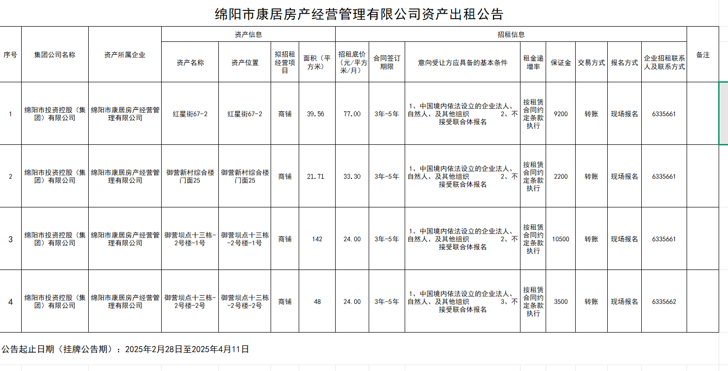 绵阳市康居房产经营管理有限公司资产出租公告