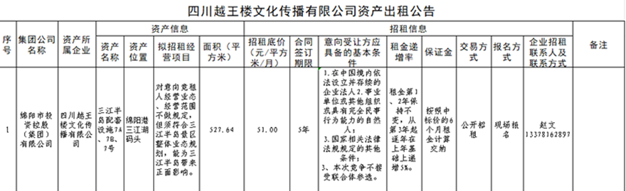 四川越王楼文化传播有限公司资产出租公告