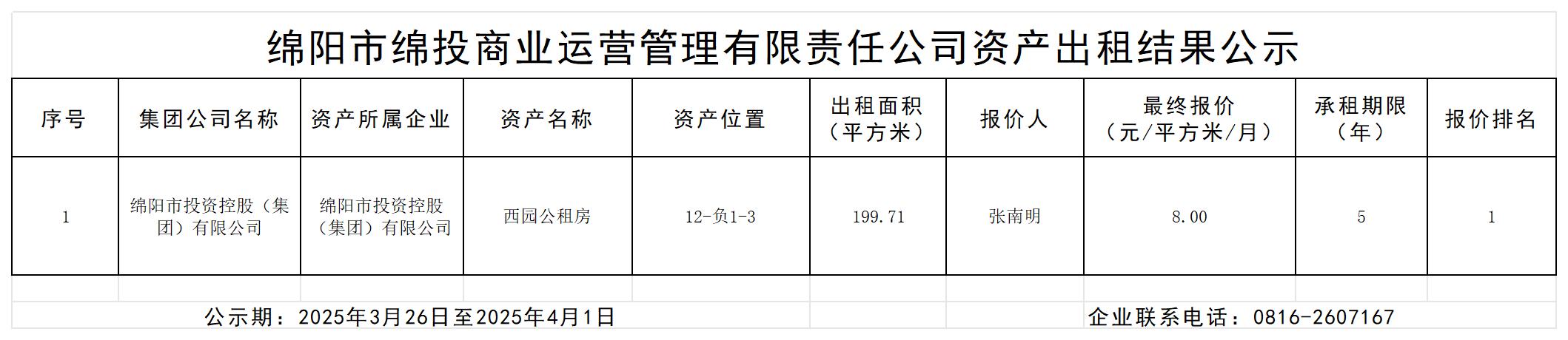 绵阳市PA真人官网商业运营管理有限责任公司资产出租结果的公示