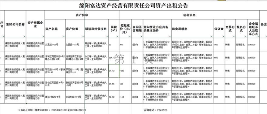 绵阳富达资产经营有限责任公司资产出租公告