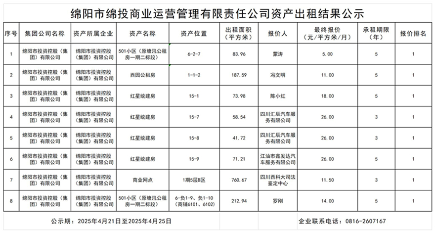 绵阳市PA真人官网商业运营管理有限责任公司资产出租结果公示