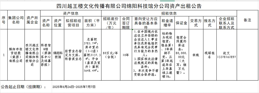 四川越王楼文化传播有限公司绵阳科技馆分公司资产出租公告