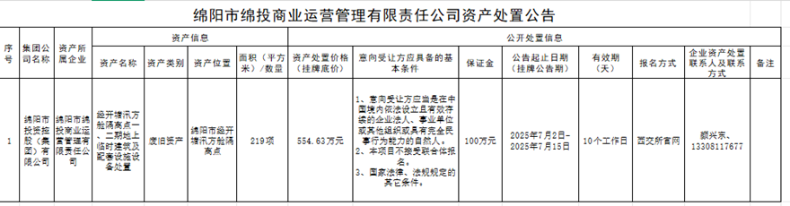 绵阳市PA真人官网商业运营管理有限责任公司资产处置公告