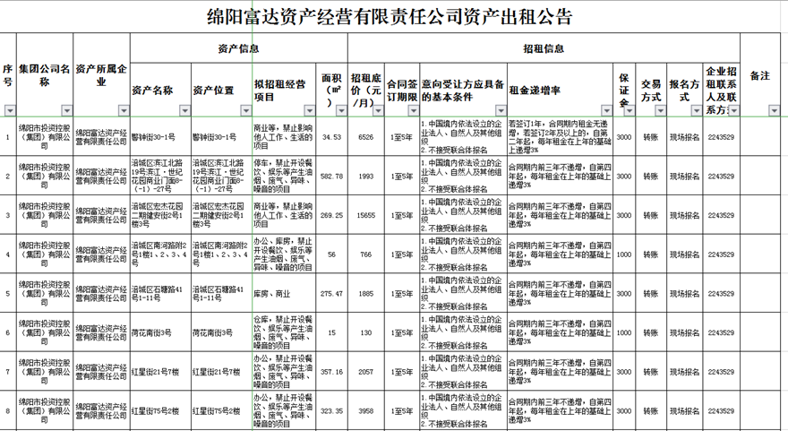 绵阳富达资产经营有限责任公司资产出租公告