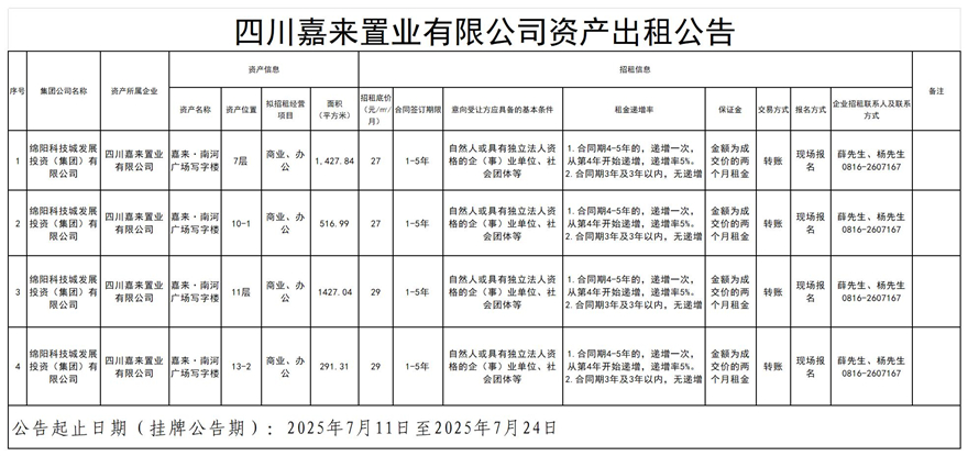四川嘉来置业有限公司资产出租公告