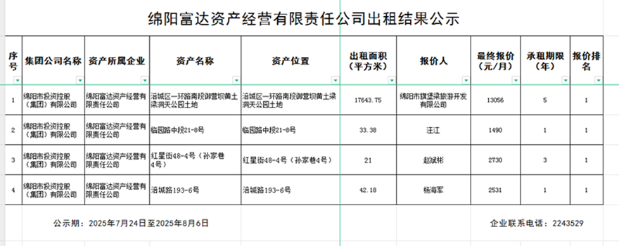 绵阳富达资产经营有限责任公司出租结果公示