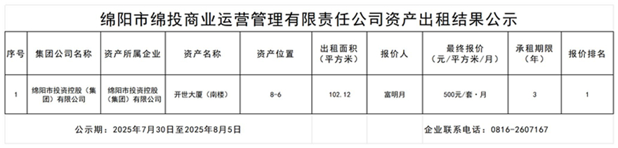 绵阳市PA真人官网商业运营管理有限责任公司资产出租结果公示