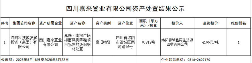 四川嘉来置业有限公司资产处置结果公示