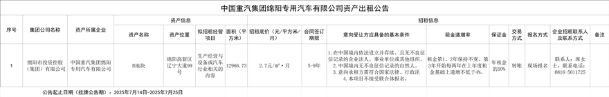 中国重汽集团绵阳专用汽车有限公司资产出租公告