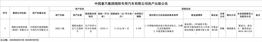 中国重汽集团绵阳专用汽车有限公司资产出租公告