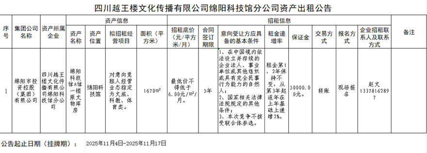 四川越王楼文化传播有限公司绵阳科技馆分公司资产出租公告