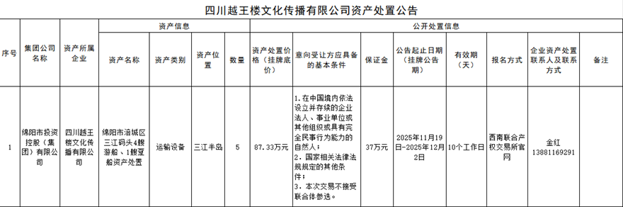 四川越王楼文化传播有限公司资产处置公告