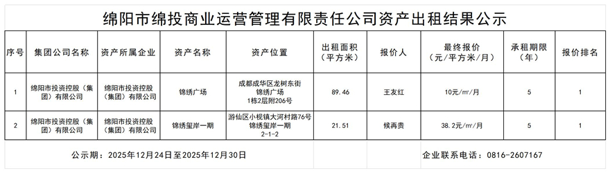绵阳市PA真人官网商业运营管理有限责任公司资产出租结果公示