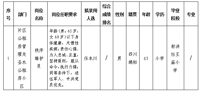 根据康居公司发布的长期招聘一线勤杂人员的招聘公告相关规定,经面试、体检等程序,拟录用任本川同志到绵阳市康居房产经营管理有限公司片区公租房管理处圣水公租房小区工作,现予以公示,具体情况如下: