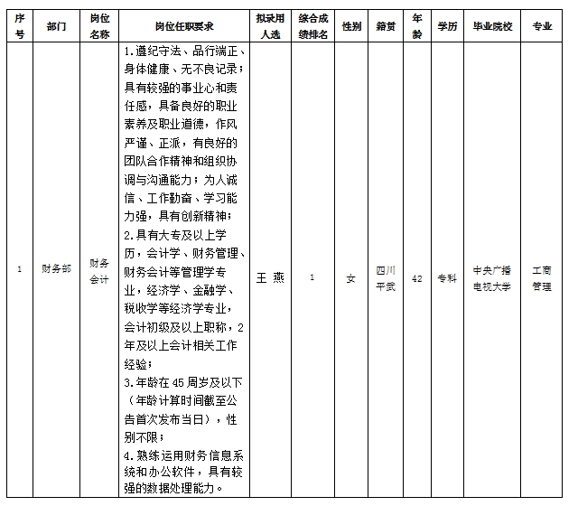 根据绵阳市绵州嘉来会务服务有限公司发布的招聘公告及招聘相关规定,经笔试、面试、考察、体检等程序,拟录用王燕同志到财务部工作,现予以公示,具体情况如下: