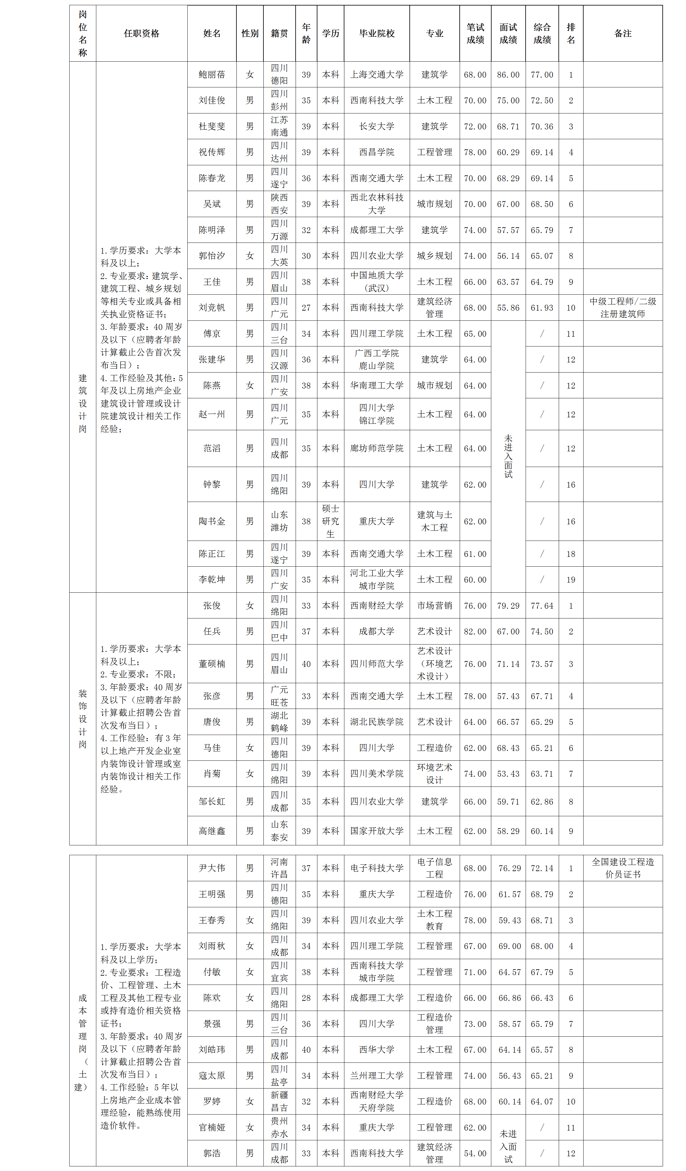 根据绵阳市PA真人官网置地有限公司发布的招聘公告及招聘相关规定,经笔试、面试等程序,现将笔试、面试成绩予以公示。