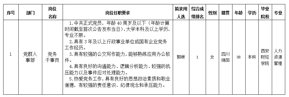根据绵阳市投资控股(集团)有限公司发布的招聘公告及招聘相关规定,经笔试、面试、考察、体检等程序,拟录用郭琳同志到绵阳市投资控股(集团)有限公司工作,现予以公示,具体情况如下: