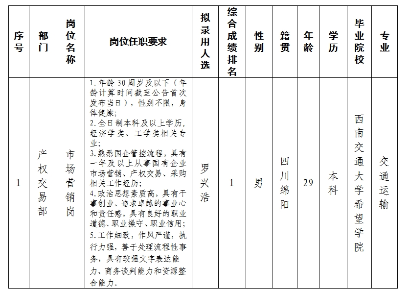 根据绵阳市PA真人官网商业运营管理有限责任公司发布的招聘公告及招聘相关规定,经笔试、面试、考察、体检等程序,拟录用罗兴浩同志到产权交易部工作,现予以公示,具体情况如下: