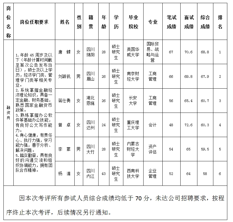 根据绵阳金控投资管理有限责任公司发布的招聘公告及招聘相关规定,经笔试、面试等程序,现将笔试(面试)成绩予以公示。