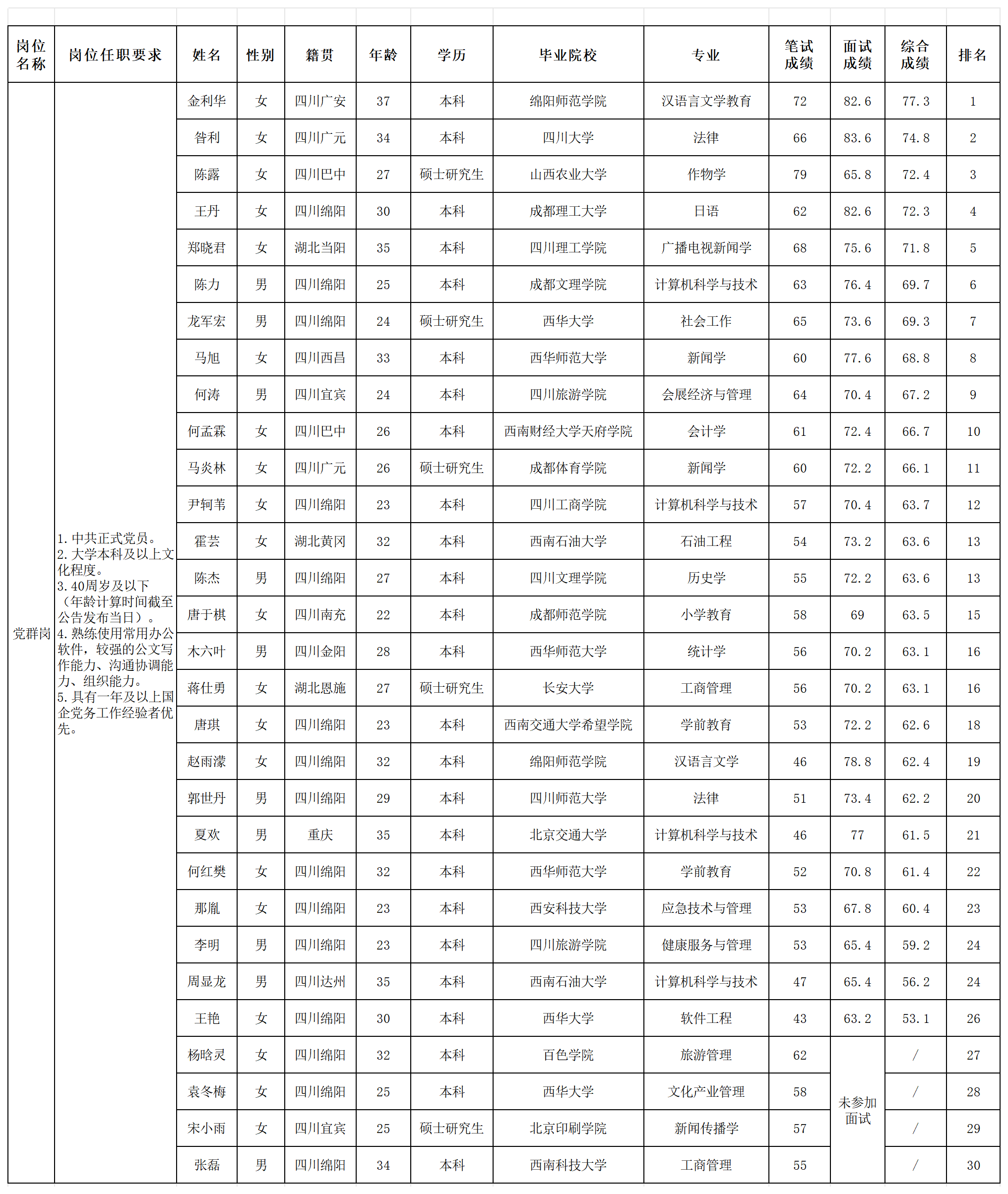 根据四川越王楼文化传播有限公司发布的招聘公告及招聘相关规定,经笔试、面试等程序,现将笔试(面试)成绩予以公示。