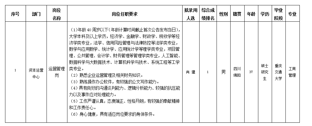 根据绵阳市投资控股(集团)有限公司发布的招聘公告及招聘相关规定,经笔试、面试、考察、体检等程序,拟录用肖建同志到绵阳市投资控股(集团)有限公司工作,现予以公示,具体情况如下: