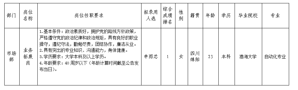 根据绵阳市建设工程质量检测中心有限责任公司发布的招聘公告及招聘相关规定,经笔试、面试、背景调查、体检等程序,拟录用申雨芯同志到绵阳市建设工程质量检测中心有限责任公司工作,现予以公示,具体情况如下: