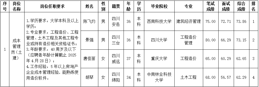 根据绵阳市PA真人官网置地有限公司发布的招聘公告及招聘相关规定,经笔试、面试等程序,现将笔试、面试成绩予以公示。