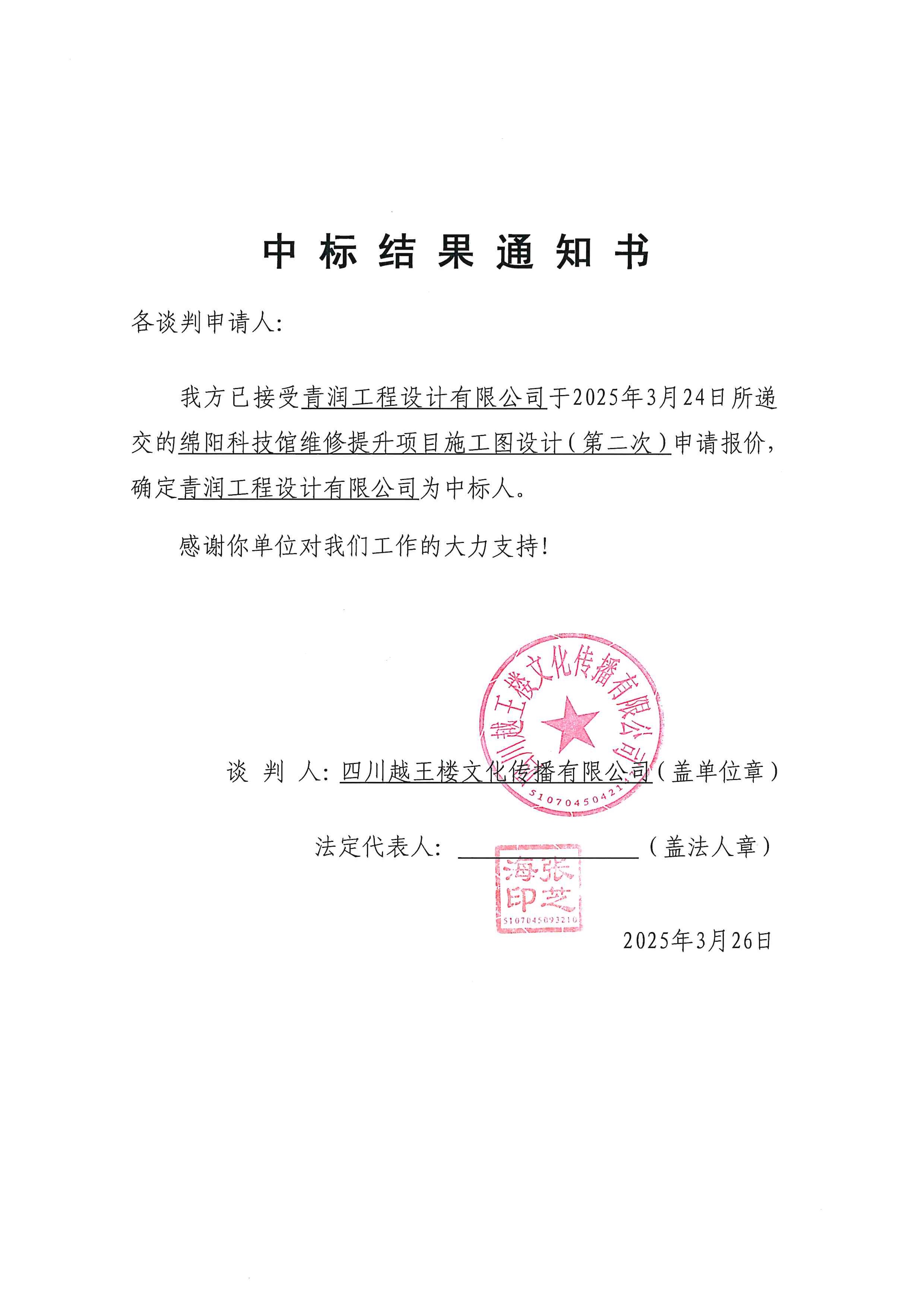 绵阳科技馆维修提升项目施工图设计(第二次)竞争性谈判结果公告
