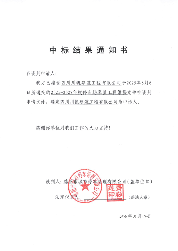 2025-2027年度停车场零星工程维修项目中标结果通知