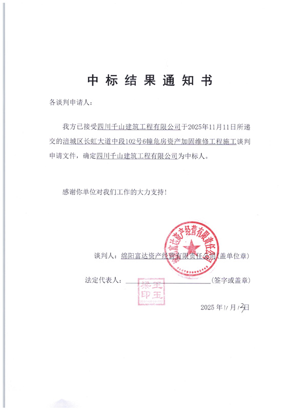 涪城区长虹大道中段102号6幢危房资产加固维修工程施工中标结果通知