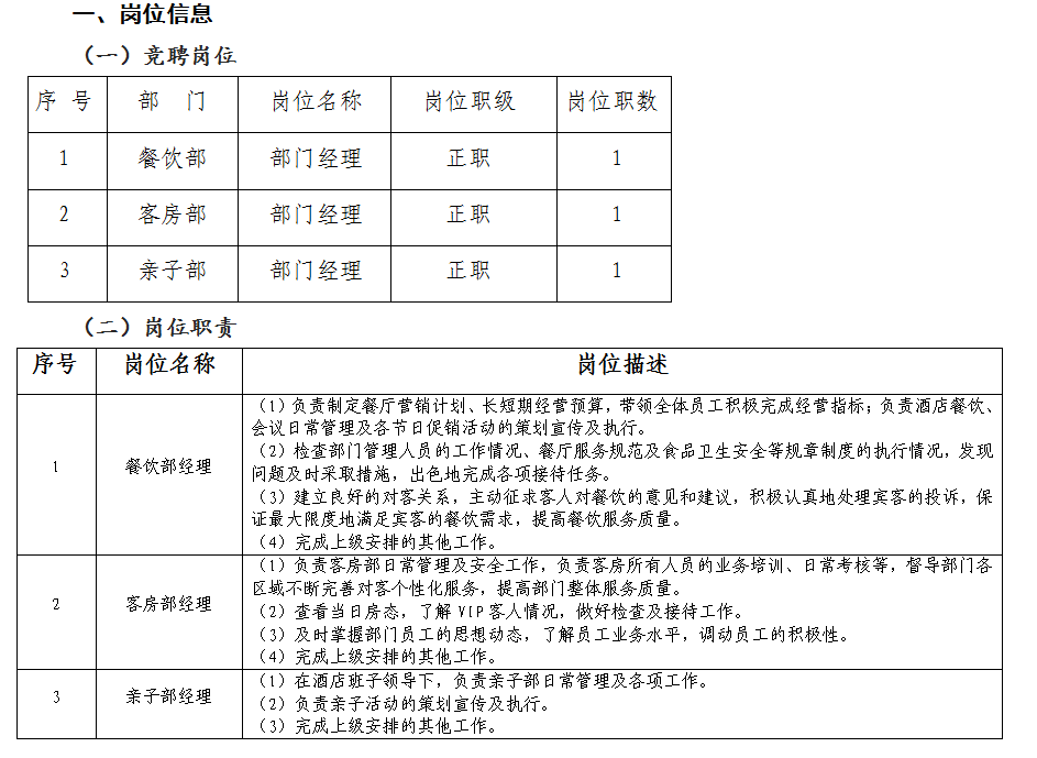(五)工作经历:与绵阳绵州酒店有限公司或绵阳市绵州嘉来会务服务有限公司建立劳动合同的人员,餐饮部经理、客房部经理、亲子部经理均要求在公司同层级副职岗位满2年以上,未满2年的一般应当在同层级副职岗位和相关管理岗位工作累计满5年以上,并在同层级副职岗位任职满1年。